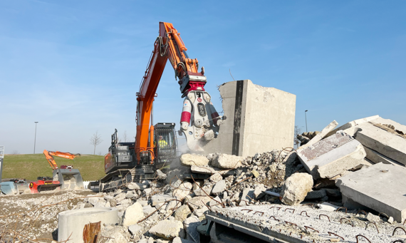 Mit dem KTEG KMC400P mit angebautem Monoblock-Ausleger und OilQuick OQ80 Schnellwechsler können wir in sekundenschnell die Demarec DCC30 Betonschere aufnehmen und den Rückbau live simulieren.